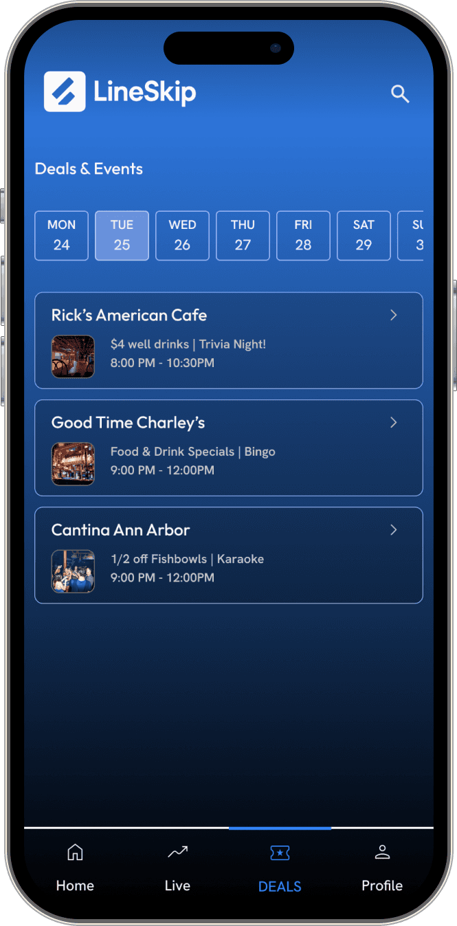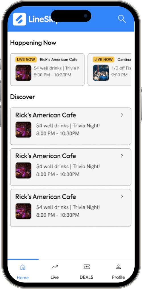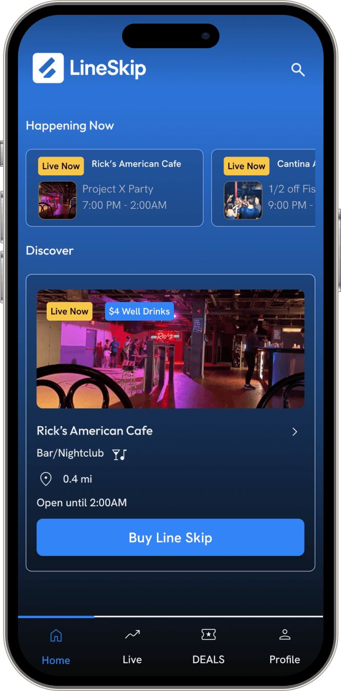 LineSkip transforms LineLeap from a basic ticketing tool into a real-time nightlife platform. The redesign centralizes live line lengths, crowd levels, cover prices, deals, and events in one place, giving students the context they need to make worthwhile decisions.