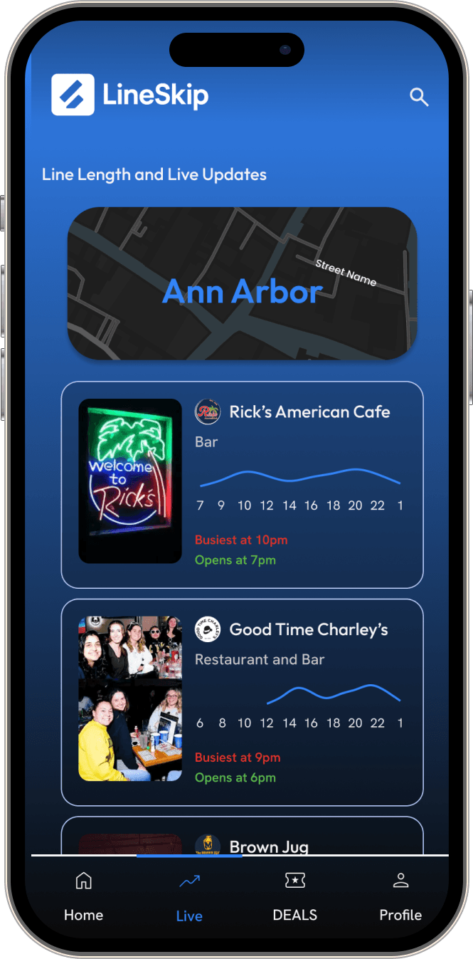 The core problem was uncertainty. Students were committing to a bar without knowing whether the line was five minutes or two hours long. With LineSkip, we implemented a live updates system that surfaces real-time and recent line patterns, visual indicators for crowd level and peak hours, and clear language built for fast on-the-go decisions. The goal was to make the most critical information the most visible thing on the screen.